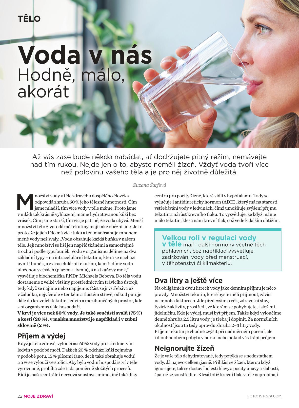 Voda tvoří nedílnou součást vnitřního prostředí organizmu. Tekutiny obsahuje každá lidská buňka, probíhají v nich veškeré procesy látkové výměny. Vodu potřebujeme pro krevní oběh, dýchací soustavu, trávicí ústrojí, pro regulaci tělesné teploty. Krev obsahuje více než 80 % vody, kosti 20 %, mozek a svaly 75 %. Celkový objem vody v těle zdravého dospělého člověka se pohybuje mezi 50 a 60 % tělesné hmotnosti.